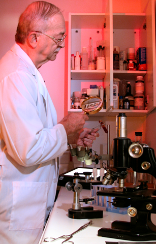 Yes, this really is a picture of Dr. Nickell playing scientist. It is a publicity shot provided by him. I kid you not.