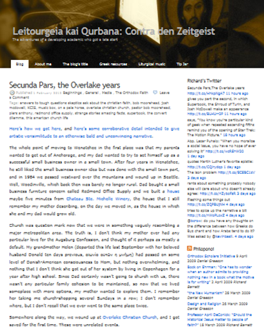 DON’T MISS Richard Barrett’s blog, Leitourgeia kai Qurbana: Contra den Zeitgeist (The adventures of a developing academic who got a late start). His latest posting, Secunda Pars, the Overlake years, is great.