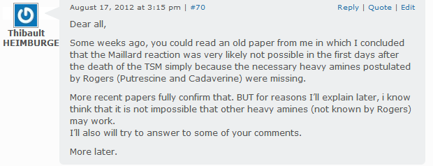 In normal conditions, maybe the amount of heavy amines seems inadequate in Rogers hypothesis. But who can say if Jesus case was “normal” ??? Who was there 2000 years ago to take measurements about the amount of amines released by the corpse ??? I think we should be very prudent before claiming “Maillard reaction was very likely not possible in the first days after the death of the TSM simply because the necessary heavy amines postulated by Rogers (Putrescine and Cadaverine) were missing.”