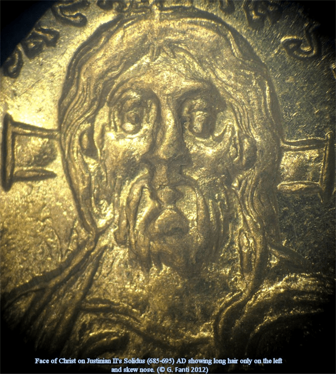 . . . an additional confirmation that the TS was the model of Christ’s images during the Byzantine Empire, I have found a very interesting variant of the Face of Christ on Justinian II’s Solidus (685-695) AD showing long hair only on the left and SKEW NOSE.