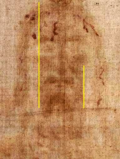 Forgive me but I’m still not clear what you’re trying to say. This is a transmitted light photo, which shows no image at all, on the face or anywhere else. As the light is coming through from behind, all the light and dark variation is caused by the thickness of the cloth at any point, which includes the backing cloth. There is no distinction in such a photo between the visiblity of the warp and weft threads. There is virtally no evidence of transverse bands (as opposed to individual threads) on the left hand side (where the ventral upper body image is), but several quite distinct ones on the right (where the ventral feet image is). The most prominent are two dark bands at the level of the hands. One of the lamps illuminating the cloth is immediately behind the image of the forehead, and shows two thin dark longitudinal stripes which can be traced to the middle of the cloth and possibly on down towards the feet.