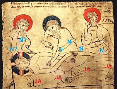 I say the illustrator of the Pray Codex recognized the existence of TWO different ttpes of linen, one shown under the body, ie.Joseph of Arimathea’s (labelled red JA) and the second in readiness, being reeled out in the background, linking the figures of Joseph, A.N.Other and Nicodemus, probably supplied by the last of that trio, along with his 100lbs of aloes and myrrh (see John) and thus lablled blue N for convenience..